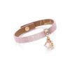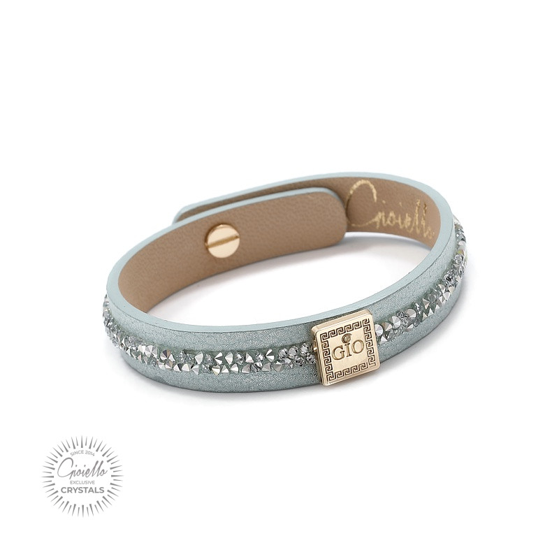 Bransoleta ze skóry naturalnej w kolorze jasnego błękitu z perłową poświatą. Na środku zakuty element metalowy z kryształem i logo. Wzdłuż kryształy Crystal Fine Rocks Swarovski w kolorze CAL metalicznego srebra. Szerokość bransoletki 1,1 cm. Możliwość wykonania rozmiaru na zamówienie po wcześniejszym uzgodnieniu. Na zdjęciu obok propozycja zestawienia – naszyjnik z tymi samymi elementami. Cena dotyczy tylko bransolety.