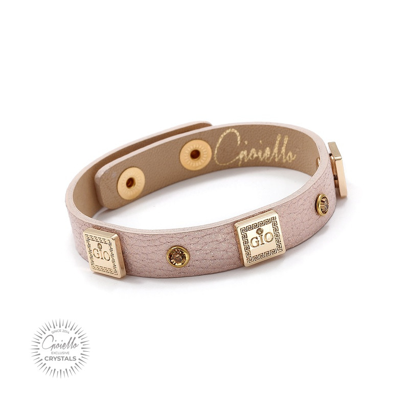 Bransoleta ze skóry naturalnej w kolorze pudrowego różu z perłową poświatą. Szerokość 1,1 cm. Elementy metalowe wysokiej jakości w kolorze złotym z kryształkami. Pomiędzy nimi kryształy w kolorze złotym w oprawach w kolorze złotym. Możliwość wykonania rozmiaru na zamówienie. Propozycja zestawienia na zdjęciu obok – naszyjnik z takimi samymi elementami. Cena dotyczy tylko bransolety.